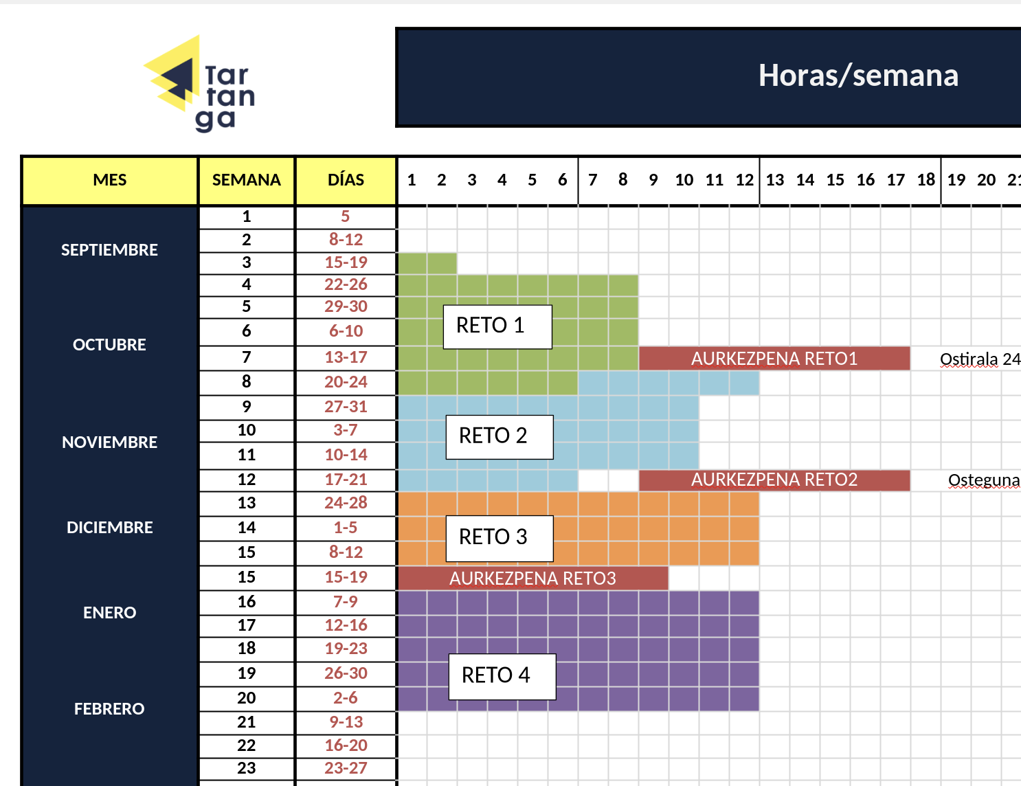 El curso se divide en 4 grandes retos donde los diferentes módulos entran y salen según el encaje definido por los docentes.